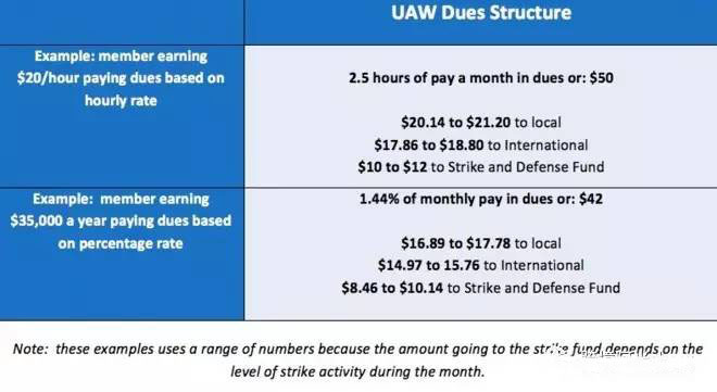 作为UAW的成员,一个每小时收入20美元的小时工,要支付每月2.5个小时的工资作为会费,平均约为50美元/月。而一个年收入约为35000美元的普通工人则需要上交月工资的1.44%,约42美元/月作为会费”---上述资料转载自:雪球,作者:weike369