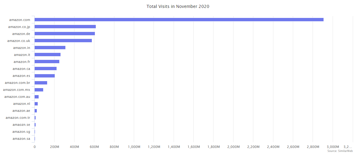 从2020年11月的访问量数据中可以看到,亚马逊美国站仍然是最重要的站点,占全球总访问量的近46%。接下来的三个站点分别是日本、德国和英国,各占10%左右。再加上印度,前5大站点就近80%的访问量。