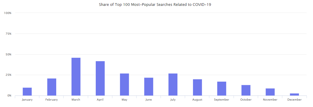上图:亚马逊上搜索量最大的100个关键词中,疫情相关商品所占比例(2020年1-12月)