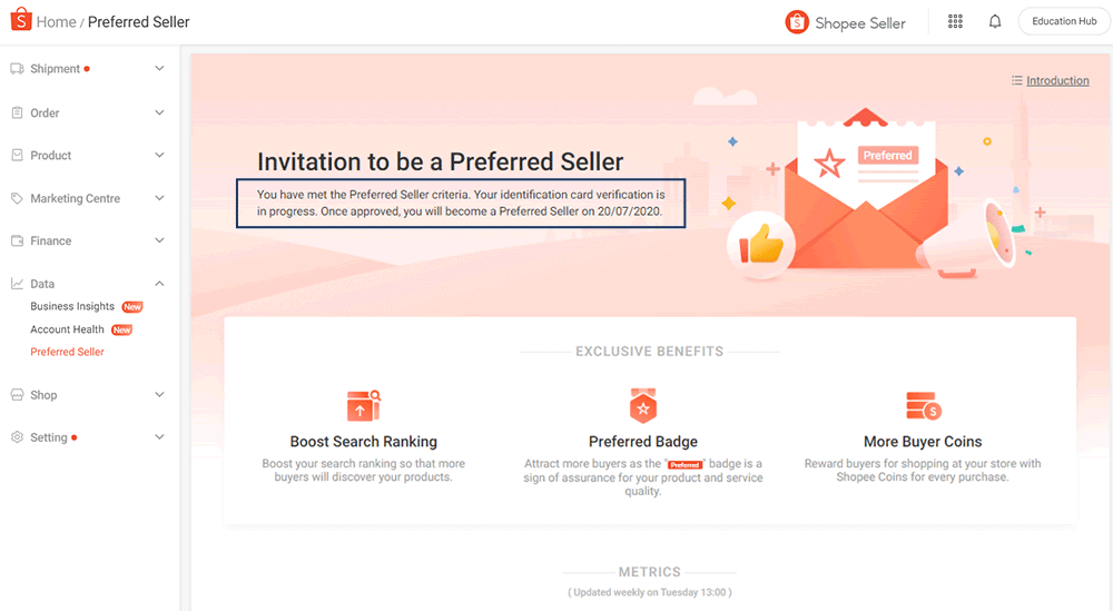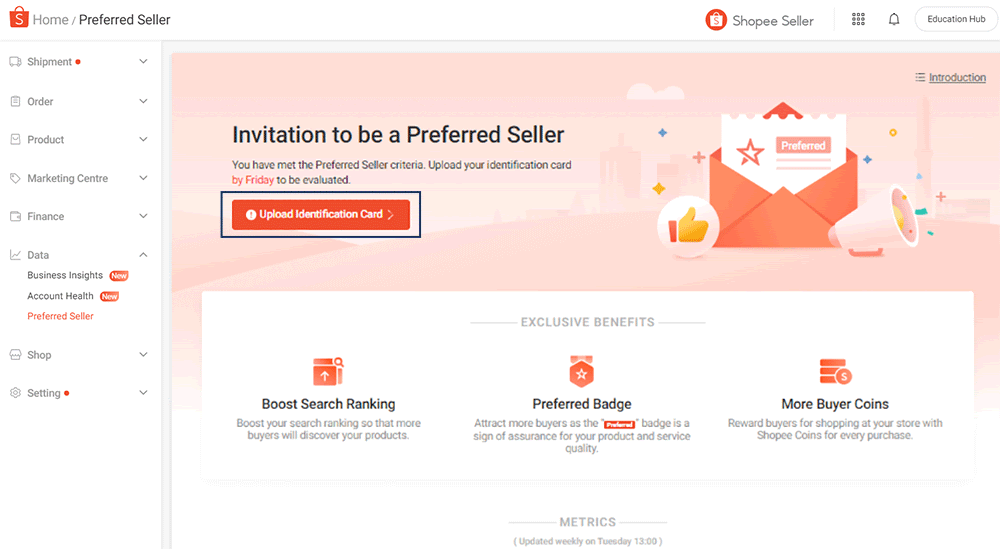 进入卖家中心,点选数据(Data)下单优选卖家(Preferred Seller)选项,点选上传身份证件(Upload Identification Card)即可接受并加入优选卖家计划。