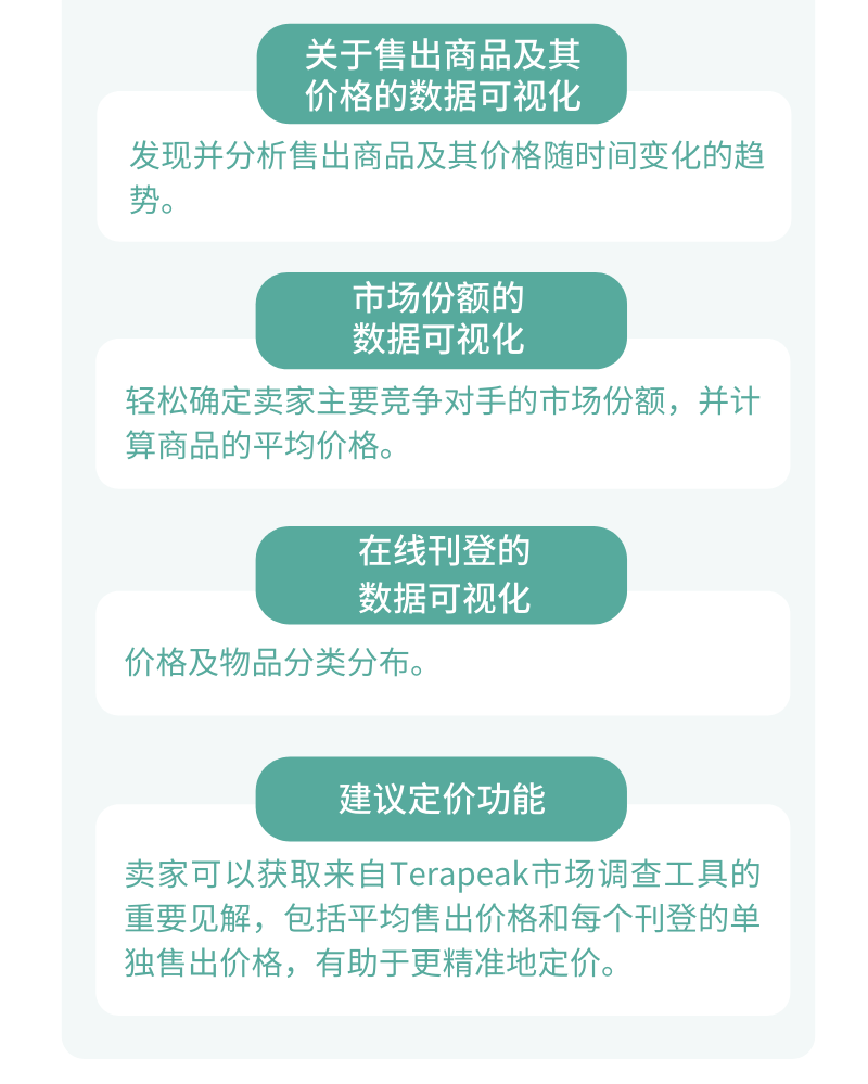 Terapeak工具研究数百万种商品的最新市场价格趋势和实际销售数据,可以帮助卖家优化刊登并提高销售速度,帮助卖家分析市场、品类、竞争、热门趋势和产品,找到eBay上最畅销的商品。它是eBay独有的市场分析工具。