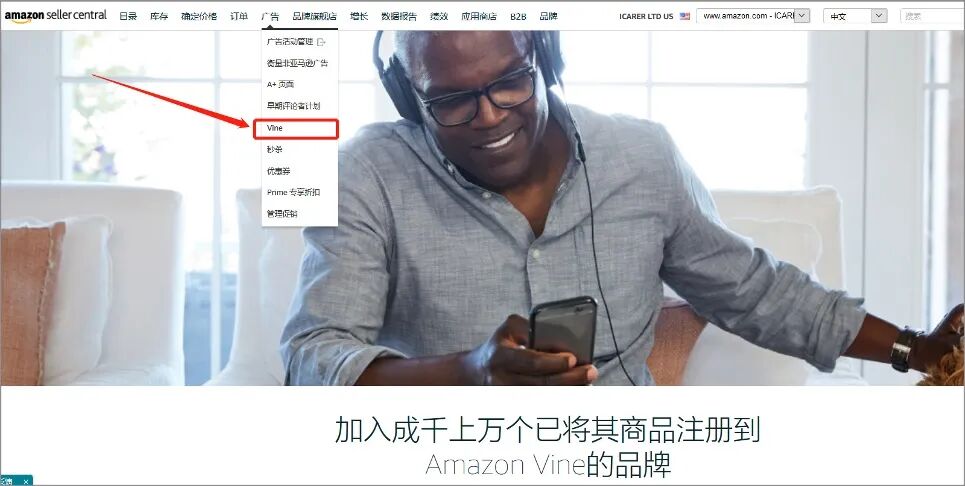 如果卖家已经进行了亚马逊品牌注册,可在卖家平台中找到广告选项中的Vine,开始使用。