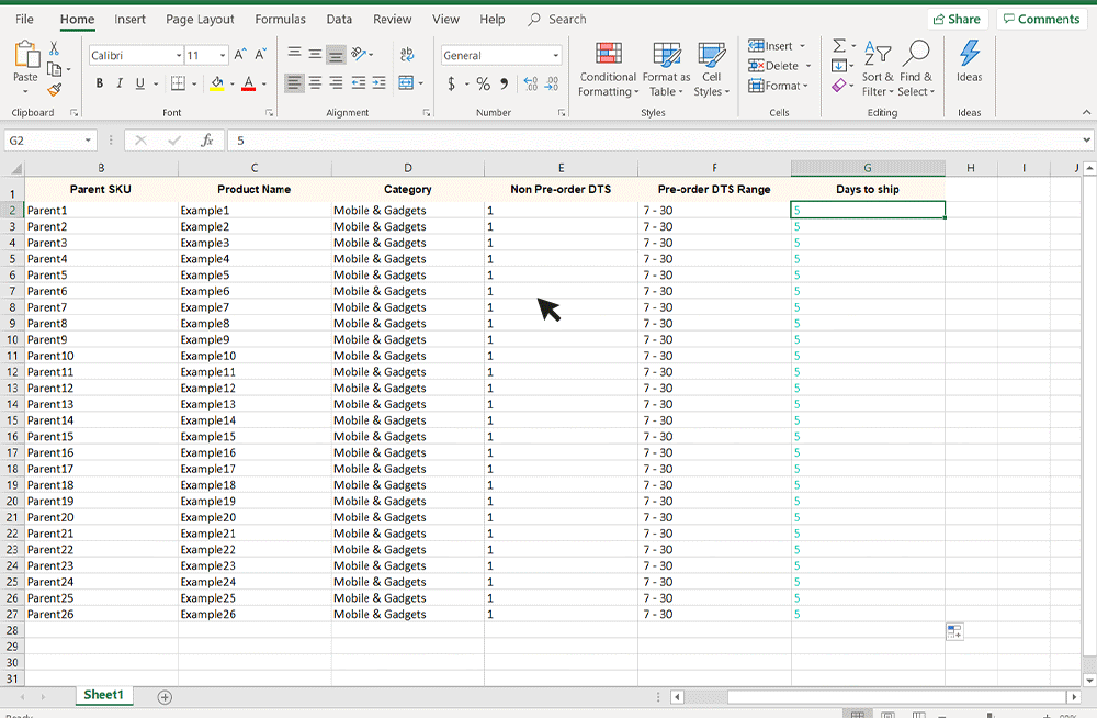 您可按上述步骤下载「出货天数资料(DTS Info)」模板并在模板中将相关商品的出货天数(Days to Ship)改为2天。