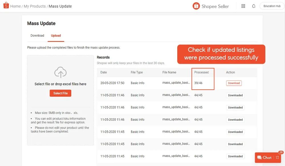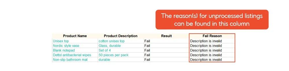 您可按上述步骤下载上传失败的模板,在「失败原因(Fail Reason)」列下查找原因,修改模板并重新上传。