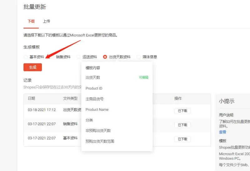 批量更新功能一共有5个模板,每个模板都是一个excel或.csv文档。您需依照您想编辑的商品信息选择对应模板。