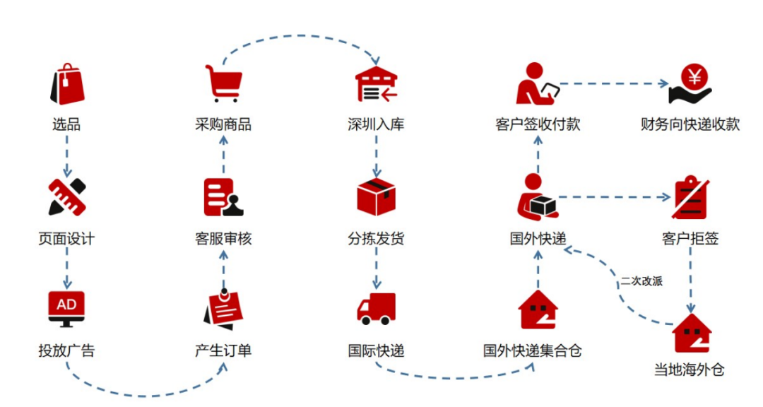 具体来说,就是针对每一样商品自建营销单页广告,并在社交网站定向投放广告,客户点击广告后被引流至公司自主开发的单页电商系统,进行商品的展示和销售,然后通过物流配送将产品送至最终消费者手中,赚取其中差价。