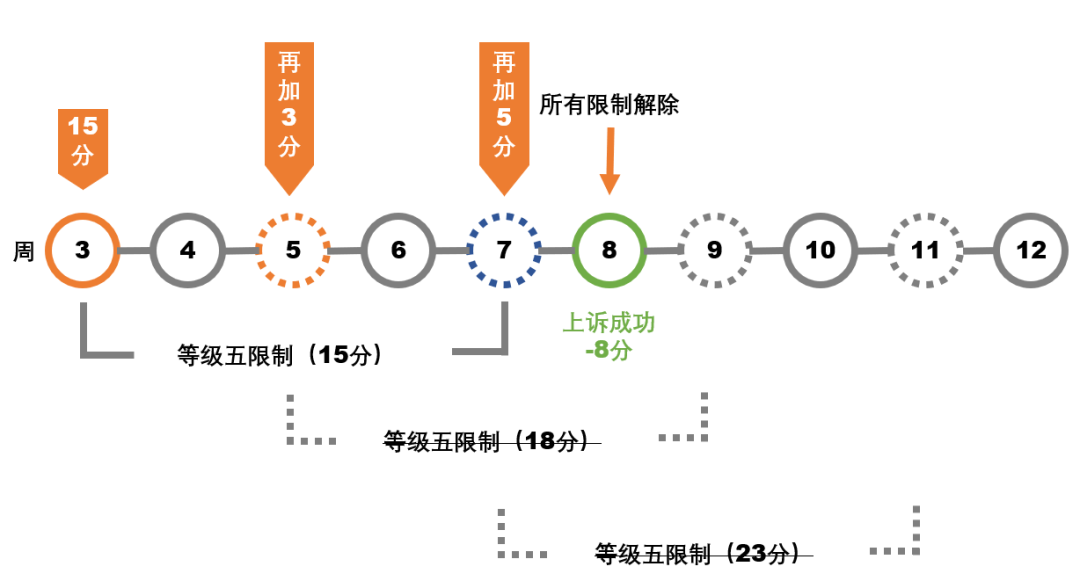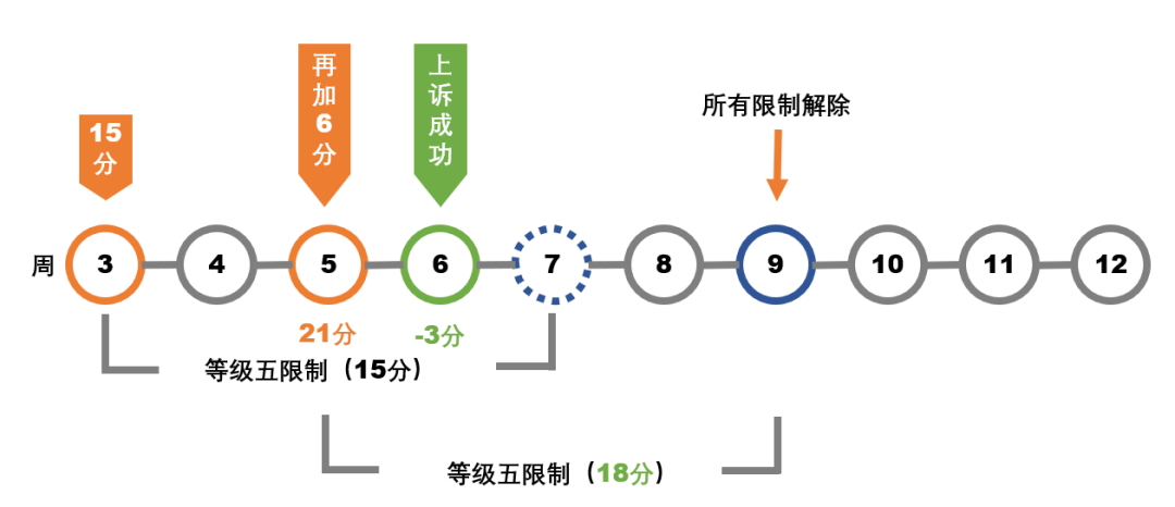 超过15分的计分将不会显示在「账户健康状态」页面但您仍会受到惩罚。计分超过15分后,每加【1分】都会受到新一轮的等级5限制。