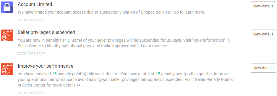 平台每周都会评估一次卖家表现并在周一更新计分。您可以到卖家中心的「账户健康状态(Account Health)」页面查看您的计分情况。当表现未达预期时,您将会被计分。不同违规行为将会产生相应计分,请参考下表。