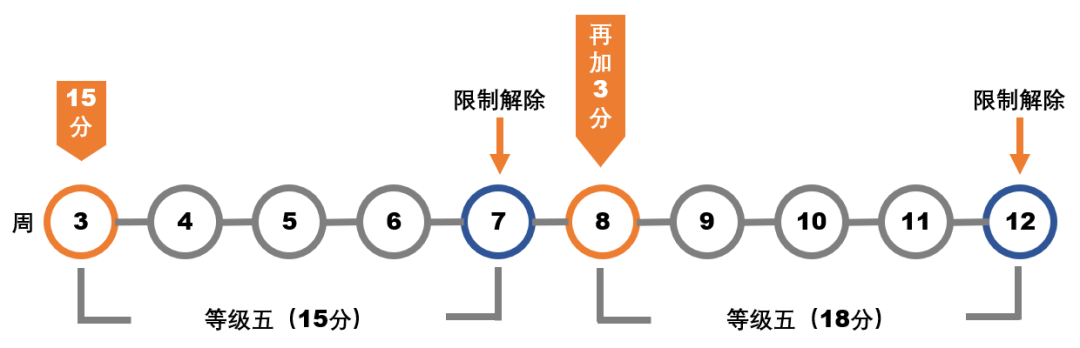 卖家小明在第三周周一(4月5日)被计了15分,从被计分当天算起,他将在28天内受到等级5的限制。在限制期间,他又在第五周周一(4月19日)被计了3分,但在卖家中心的「账户健康状态」页面所显示的计分仍是15分。由于小明的总计分已达到18分,他的等级5限制将会延长到第九周周一(5月17日)。