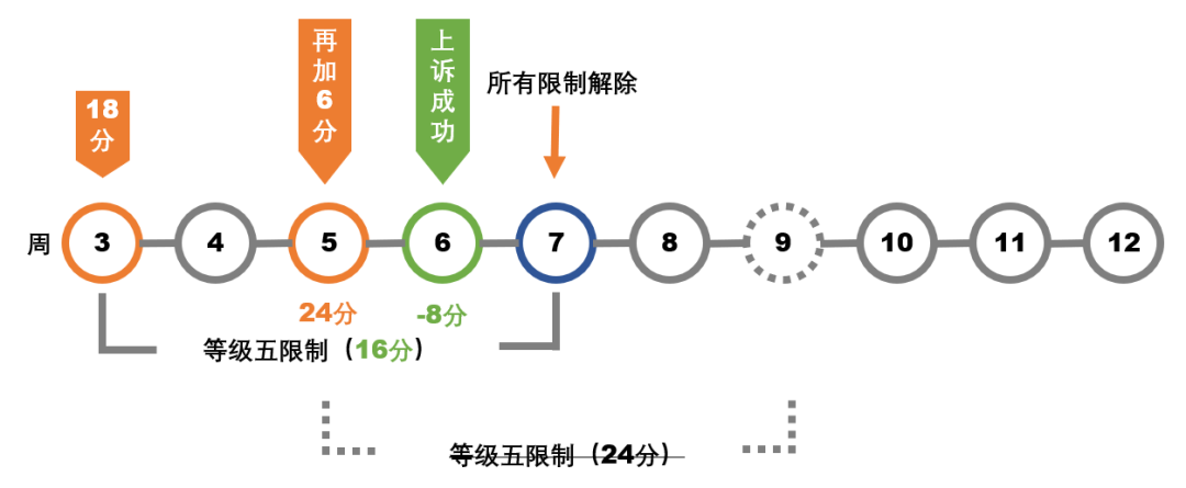 卖家小明在第三周周一(4月5日)被计了15分,从被计分当天算起,他将在28天内受到等级5的限制。在限制期间,他在第五周周一(4月19日)又被计了3分。由于小明的总计分已达到18分,他从第五周周一开始将受到第二轮的等级5限制,直到第九周周一(5月17日)。在限制期间,小明在第七周周一(5月3日)又被计了5分。由于他的总计分已达到23分,小明从第七周周一开始将受到第三轮的等级5限制。小明不服,在第八周提起申诉。平台判定这23分里有8分属于不合理计分。不合理计分被移除后,小明累计的总分为15分,由于第一轮限制已在第七周结束,小明的限制在申诉成功那天起将被移除。