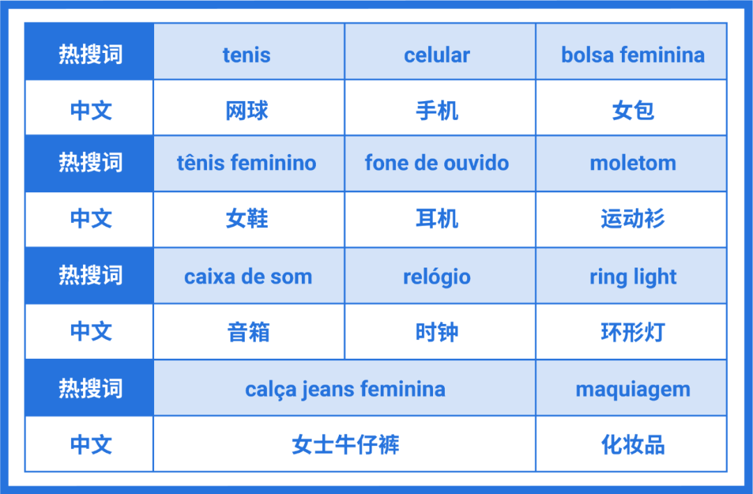 巴西市场正值冬季,消费者对女鞋、运动衫和牛仔裤等需求都应以“保暖”为主;奥运期间,网球相关的运动关键字占据榜首,卖家可对某一关键词发散思维,考虑网球衫、网球拍等等相关产品。