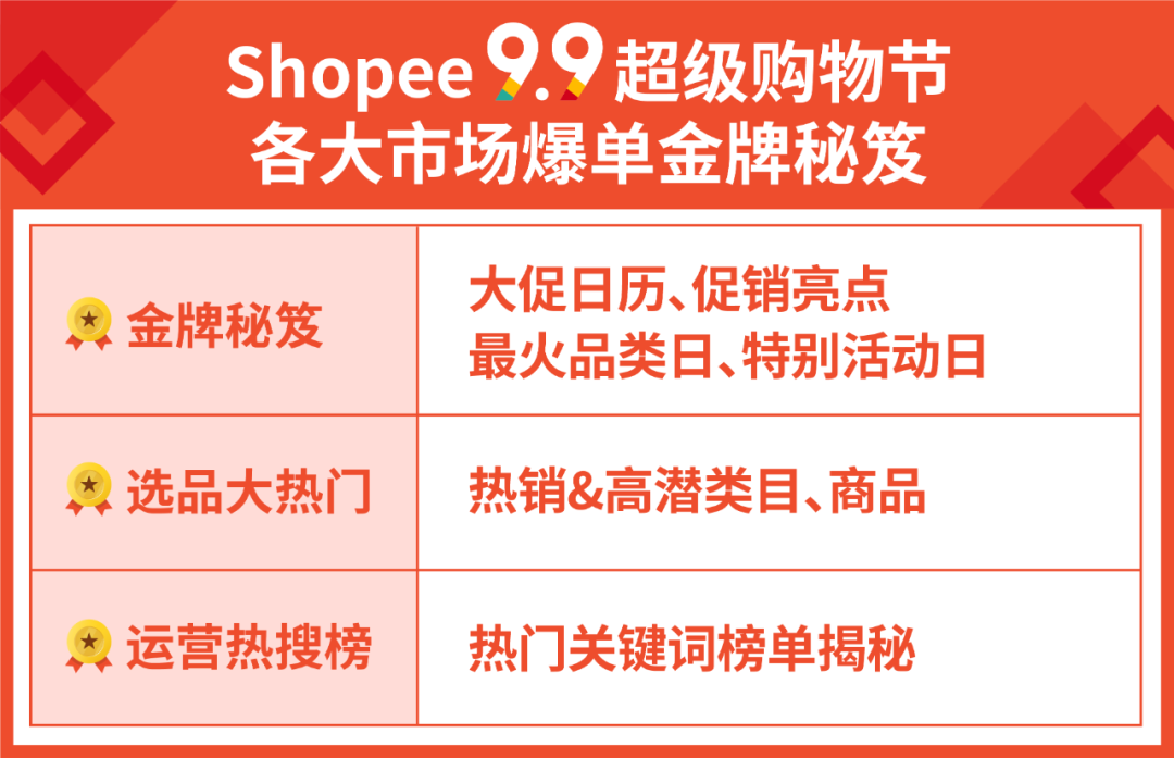 下面小编从引流、选品和运营3方面呈上Shopee各大市场的9.9大促日历、促销亮点、品类日、大促热销&高潜类目、商品,还有最新的热搜关键字榜单,助力卖家备战9.9, 单量夺冠,拿下销量金牌!