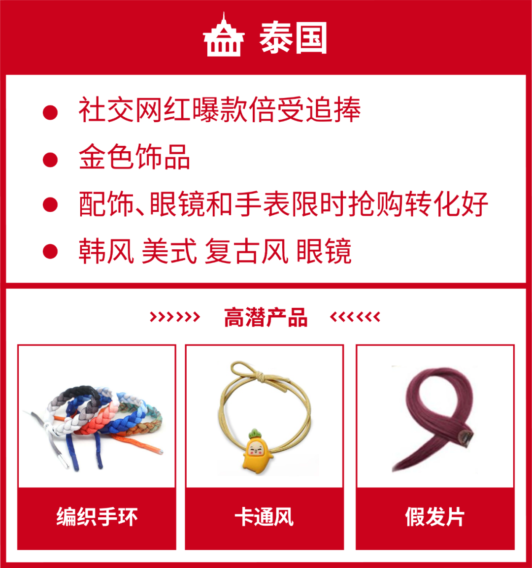 泰国市场非常年轻化,也是东南亚社交媒体网络发达程度最高的一个市场。由于饰品受到时尚潮流的影响非常大,其中泰国的时尚潮流KOL对消费者影响较大,网红搭配的饰品更容易受追捧。同时泰国是一个佛教国家,带有金色元素的饰品卖得非常好,但相关产品布局目前仍属于蓝海,打造爆款的机会千万别错过。