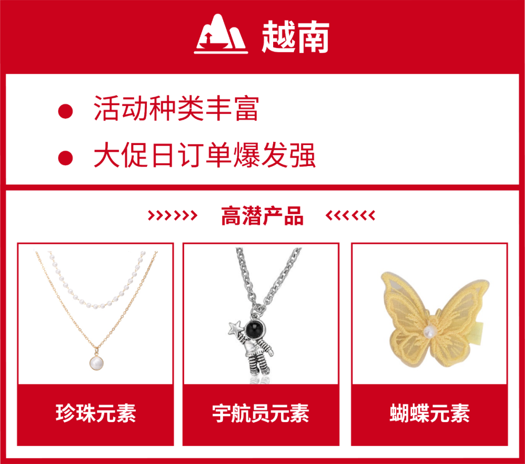 在东南亚,珠宝首饰的畅销品类尚有发展空间,卖家还有更多追击热卖品的机会。尤其在越南、菲律宾、泰国和马来西亚四大市场更是机会多多,下拉收藏轻松打造爆款!