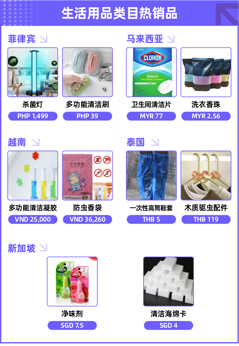 东南亚气候类型多为热带季风气候、热带雨林气候,夏季潮湿且蚊虫多,因此室内驱虫防虫有巨大的需求量,其中防虫香袋、捕蚊灯及木质驱虫配件销量节节攀升。商家在设置关键词和详情时建议依据产品实情,突出绿色天然、无毒无害、清香消臭、覆盖范围广、防虫种类多、持续时间长等特性。此外东南亚买家更愿意购买多功能产品,商家选品时建议挑选防虫、防霉、防黄三合一产品上架。