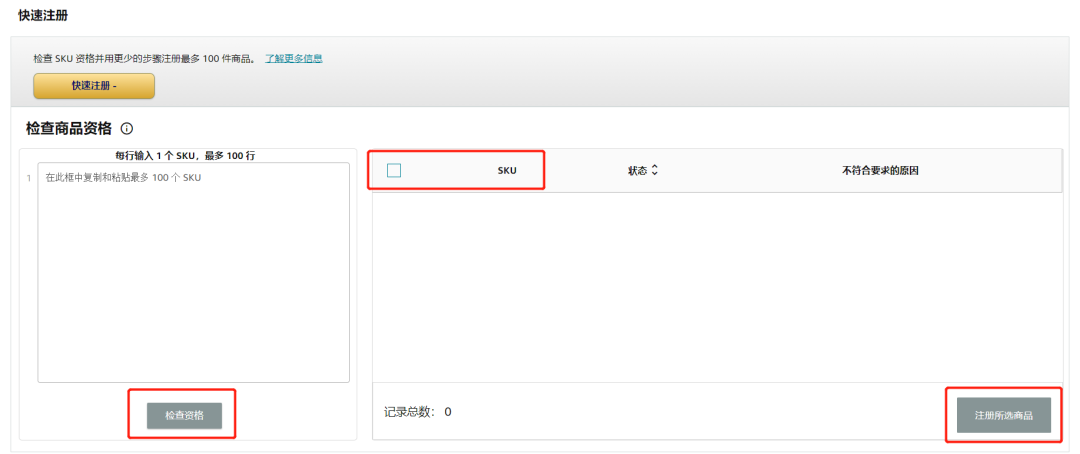 选择【快速注册】,将您的SKU粘贴到文本框(每个SKU1行)中,然后点击【检查资格】,选择全部SKU,点击【注册所选商品】。请您在所有目标商城中复制这些操作。