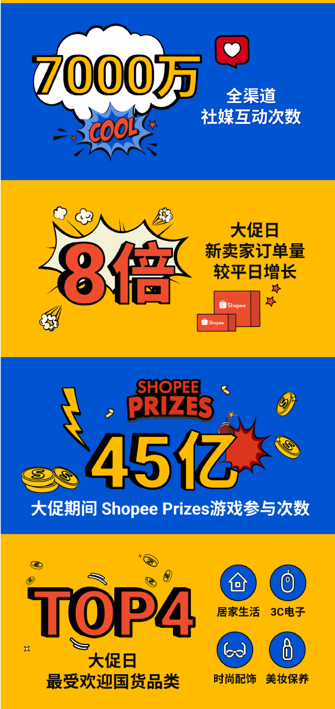 Shopee 9.9超级购物节完美收官!在2021下半年旺季首场超级大促中,交出亮眼成绩单:首99分钟平台共计出售超4500万件商品!Shopee Prizes创下45亿次游戏记录,Shopee Live观看时长达2400万小时。Shopee 通过丰富的活动形态,满足消费者多样化的购物需求,同时积聚流量助力卖家爆单。借助Shopee一站式卖家解决方案和站内外整合营销支持,平台新卖家首战告捷,大促当日订单量较平日增长8倍。