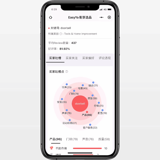 通过EasyYa易芽选品插件,我们可以知道买家吐槽最多和最关注的点是什么,明确产品优劣势,挖掘产品使用人群和场景,从而精准优化运营策略。