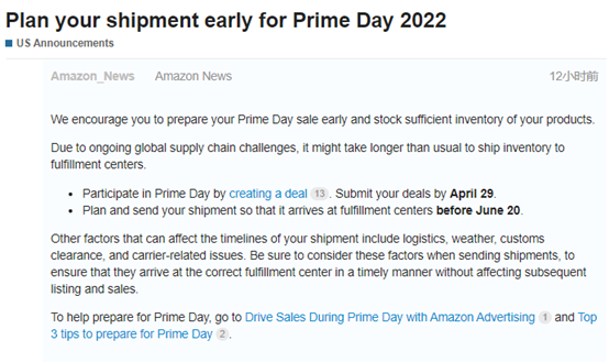 想要靠Prime Day打场漂亮翻身仗的卖家,一定要认真看了。亚马逊美国站发布一则公告称,提醒卖家尽早为2022年Prime Day做好库存准备。
