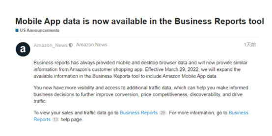 日前,亚马逊发布最新公告,称2022年3月29日起,亚马逊将为卖家提供来自亚马逊移动端App的流量信息,卖家可自行在业务报告查看相关数据。