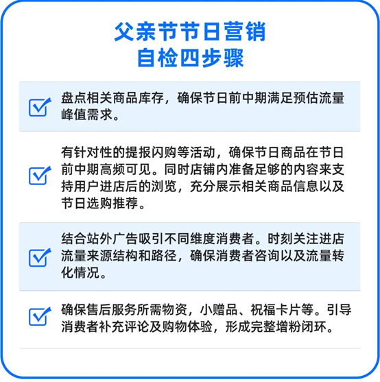 最后,小编还为商家朋友们准备了一份父亲节促销前的“自检四步骤”。准备节日营销的商家快来看看是否都完成以下工作了。
