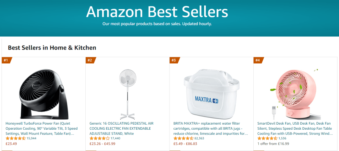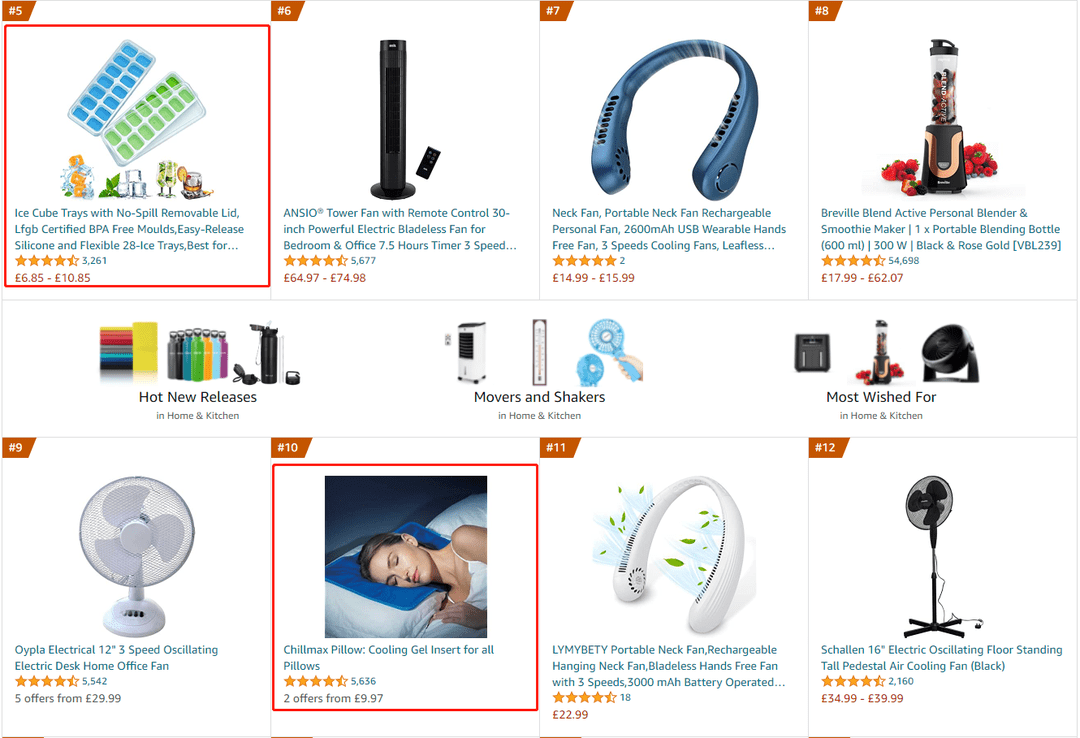 今天,亚马逊英国网站家庭和厨房类别畅销榜单中,销量最高的15件商品中有10件是风扇。此外,亚马逊英国网站的“最畅销商品”页面显示,冰盘和枕头的“冷却凝胶插件”也很受欢迎。
