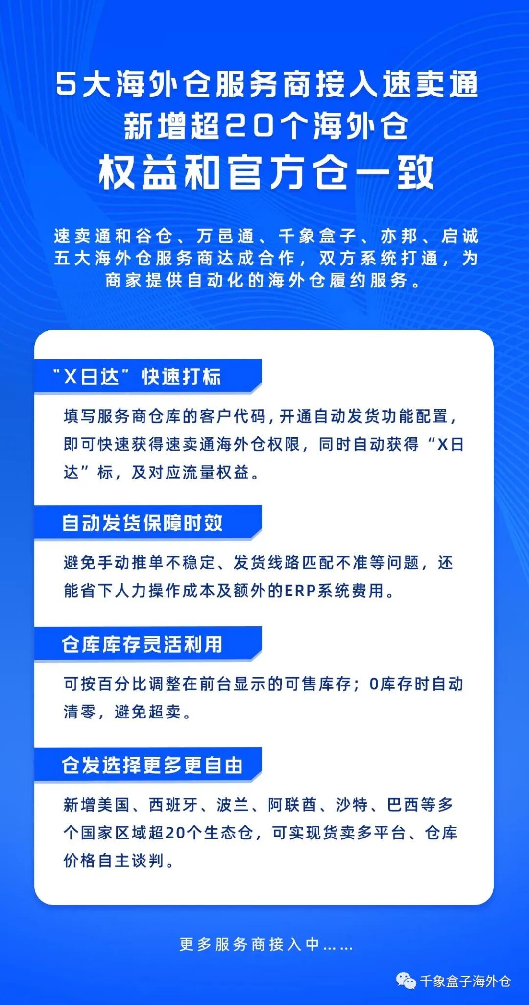 据悉,直连速卖通系统后,备货在这些服务商仓库的商家可以快捷申报海外仓及拿到“X日达”标识;同时备货更灵活自由,可实现货卖多平台、仓库价格自主谈判等。