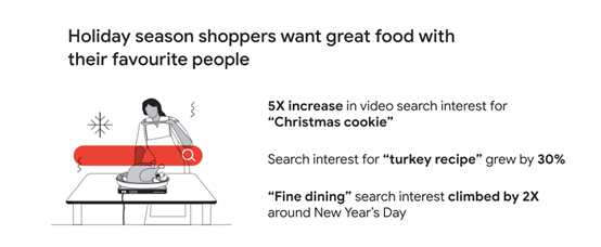 人们还从视频中寻找传统烹饪灵感。与去年 11 月相比,12 月在 YouTube 上“火鸡食谱”的搜索热度上升了 30%,其中“圣诞饼干”的搜索热度同比增长了 5 倍多。