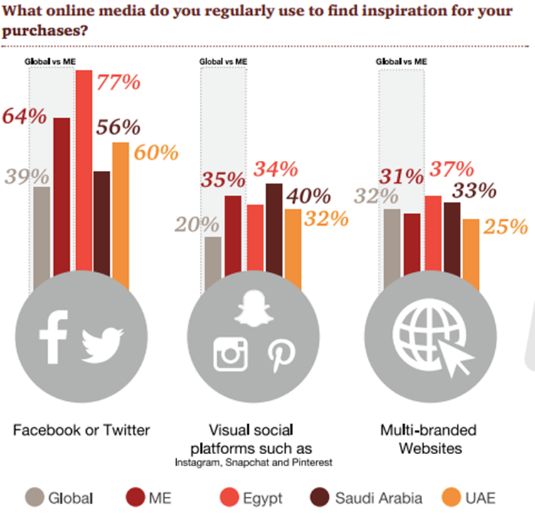 与此同时,根据PWC的数据显示,也有64%的中东购物则使用Facebook 或者 Twitter找到心仪的事情进行购物。另外,在Instagram上发放广告也是电子商务零售商进入中东市场的有效途径之一