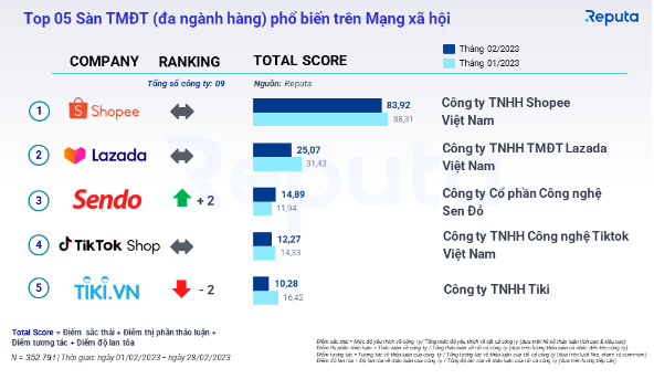 近日,Reputa 发布了 2023 年 2 月越南各大电商平台在网络上的受欢迎程度排行榜。