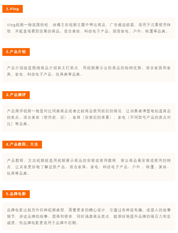 Vlog、产品介绍、产品测评、产品教程、方法适合推商品,品牌电影适合推品牌。其中Vlog和产品教程、方法的投放场景是商品详情页和品牌旗舰店,产品介绍、产品测评、品牌电影的投放场景是品牌推广视频、品牌旗舰店、商品详情页。