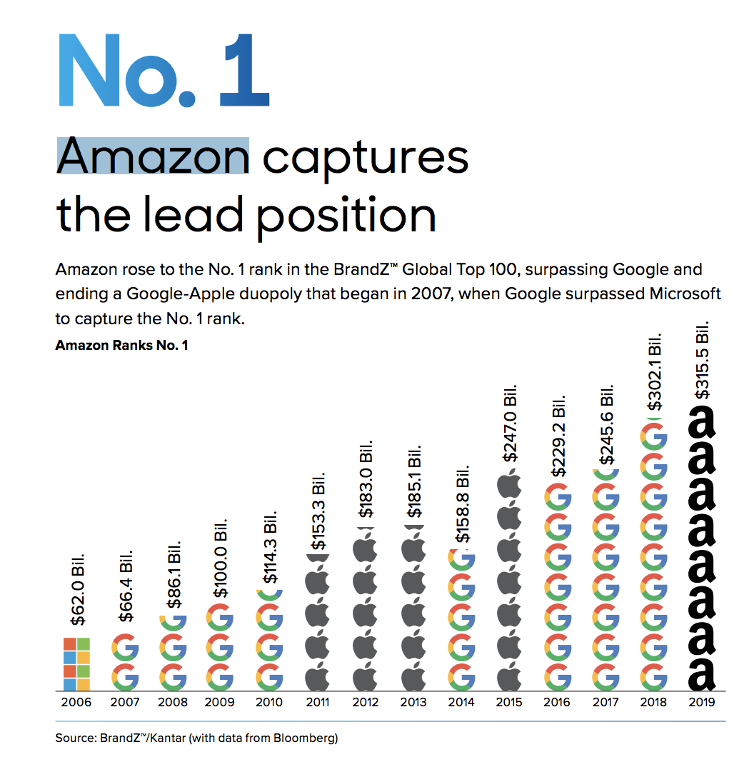 BrandZ最新发布的全球最有价值品牌100强调查显示,亚马逊(Amazon)超过苹果(Apple)和谷歌,成为全球最有价值品牌。亚马逊的业务价值达到3155亿美元(247.33英镑),同比增长52%。