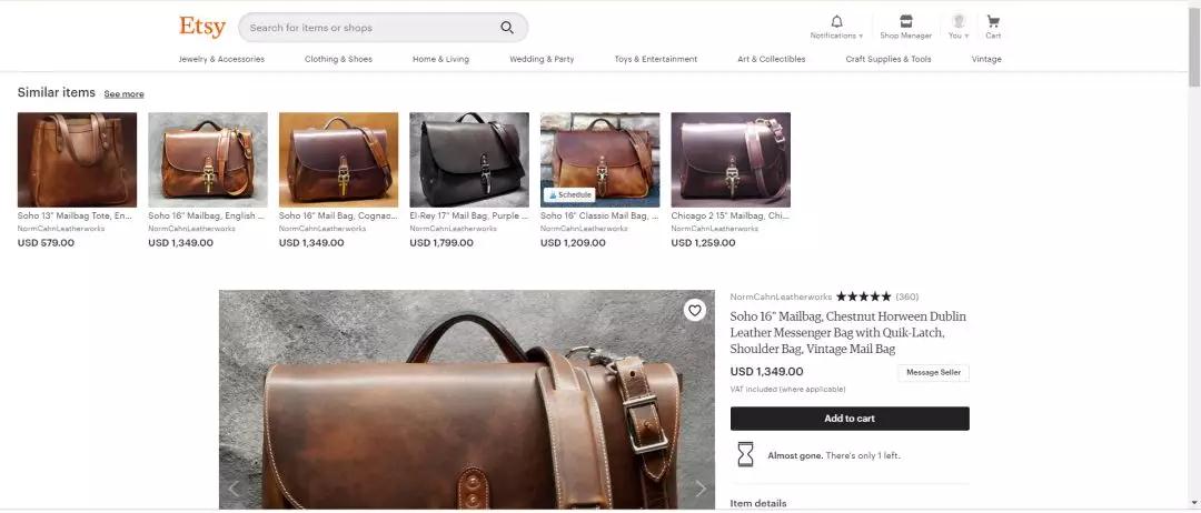 这是一个关键词进去出现的关于皮革制品的一系列的产品,然后图示就是一个产品的pin,然后鼠标放上去就是显示的ETSY 的产品,然后我们点进去就是一个ETSY的店铺:
