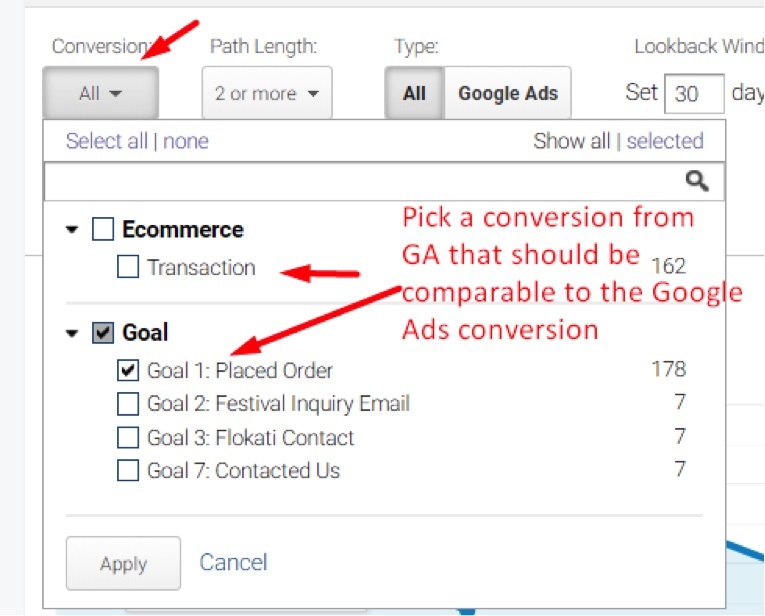 在下面的示例中,可以选择“Transaction”或“Goal 1: ordered”,因为两者的总转化数量几乎相同。