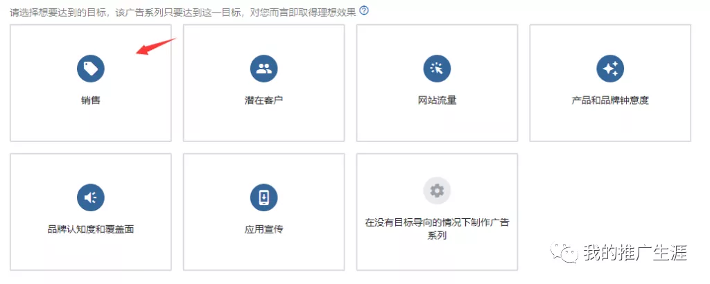 首先在谷歌广告后台界面,添加新的广告系列,选择“销售”目标。
