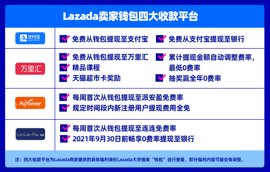 目前,Lazada仍然会以周的频次为商家结算货款,并统一结算至卖家钱包, 商家可根据自己的需求手动选择任意时间提现至派安盈、支付宝、万里汇或者连连账户。