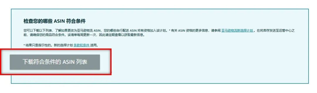 您可以在该计划的活动页中,点击“下载符合要求的ASIN列表”按钮,下载您目前在售的商品中符合该计划的要求的ASIN清单。当您注册加入该计划后,将这些ASIN转化为使用FBA销售并发送入库,即可享受该计划的优惠福利。