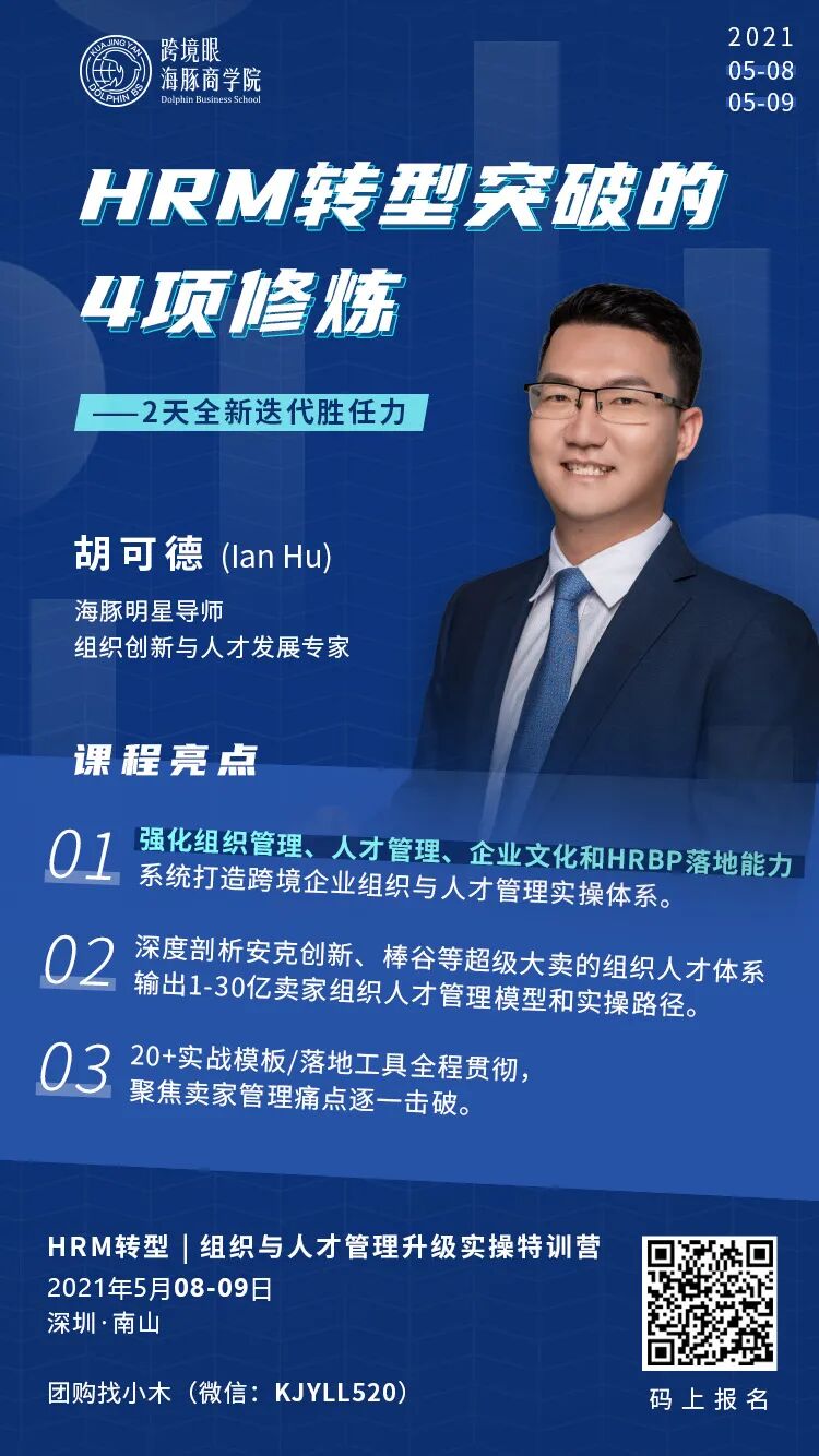 5月8日至9日,跨境眼海豚商学院将邀请到人才管理资深讲师胡可德老师,针对跨境电商企业,进行为期两天的人才管理实战干货分享。