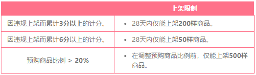 除了上述限制外,因违规上架而被计分也将使您受到上架商品数量的限制。