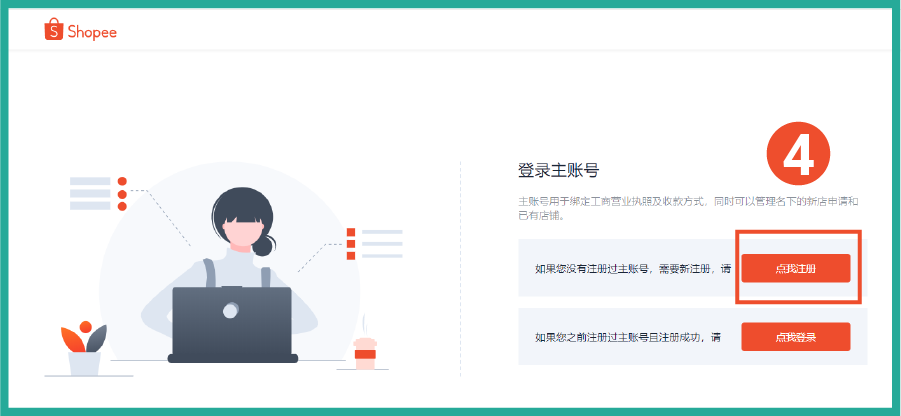 首次入驻Shopee的卖家,请点击“点我注册”;若已经注册过主账号且注册成功,则直接点击“点我绑定”继续提交资料即可~