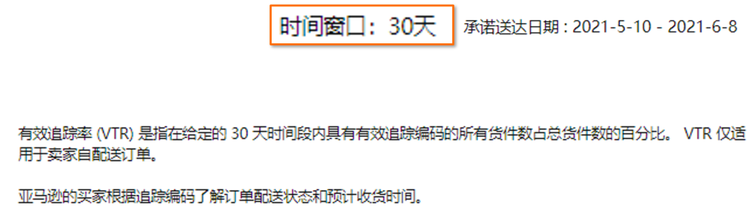亚马逊将基于给定的过去30天(预计送达日期)滚动周期,基于自配送订单下的各个商品分类,来测量得出卖家所有分类的有效追踪率。