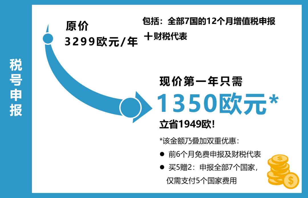 ???在前六个月免费申报的福利下,同时支持按月扣费,卖家进入服务后,只需先花费50欧元注册费用,即可尝试体验一站式增值税服务!