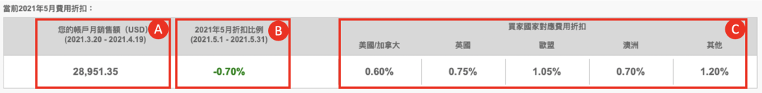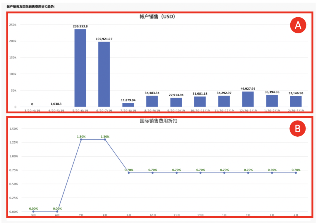 基于帐户销售额,通过对照各销售额区间对应的折扣比例,预测下个月帐户可能享受的折扣比例,以及对应的按买家国家细分的国际销售费用折扣。