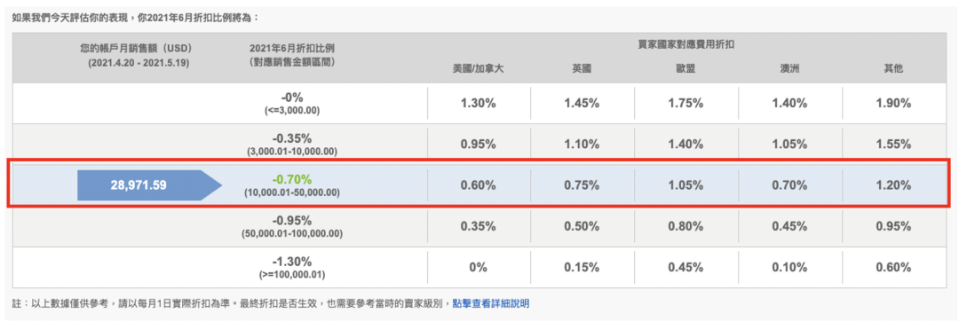 (https://www.ebay.com.hk/pages/help/sell/fees-cbt-gc.html#sc_version),对于级别为“合格卖家(Above Standard)”及以上的eBay卖家,如果前一个月在所有eBay站点的总销售额(包括运费)达到至少3,000美元,下一个月就可以享受国际销售费用折扣。具体折扣见下表: