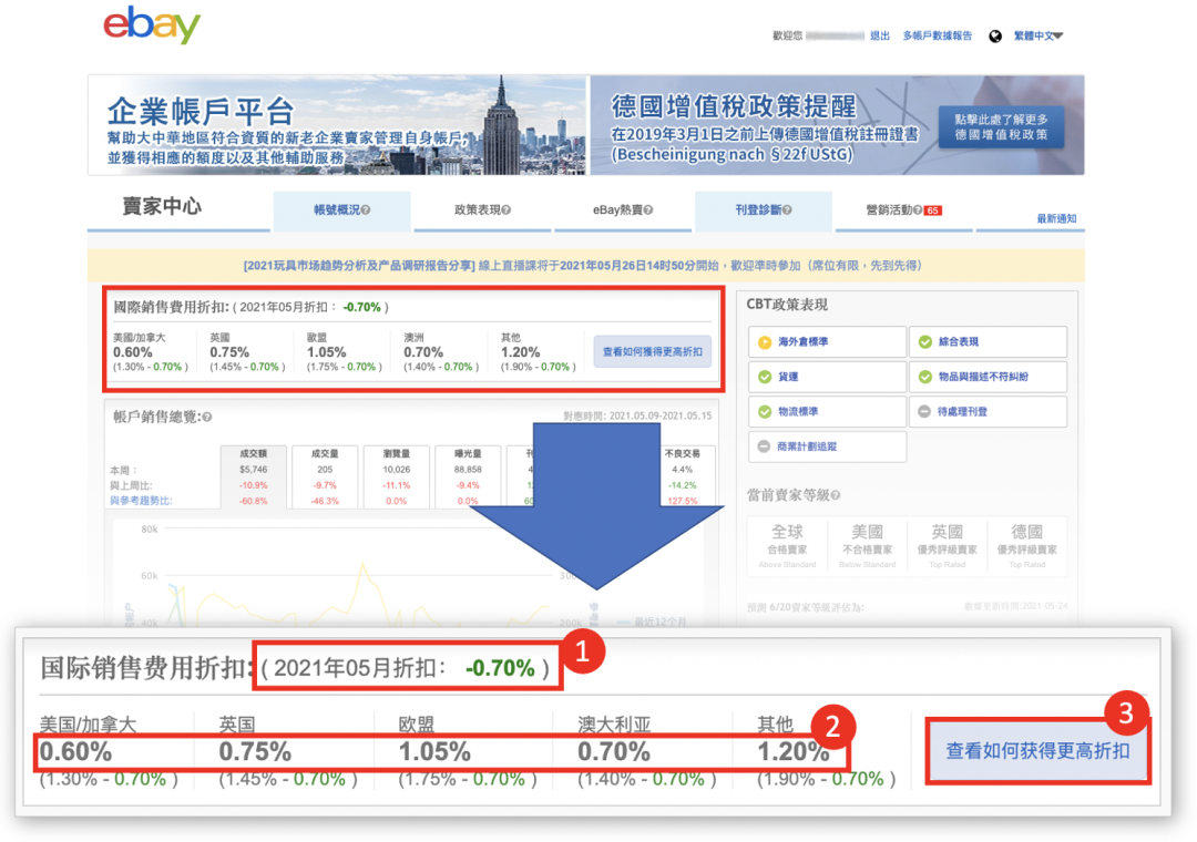 登录https://cbtreport.ebay.com.hk/进入“卖家中心”。可以看到,卖家中心首页新增国际销售费用折扣报告入口,包括以下三部分内容: