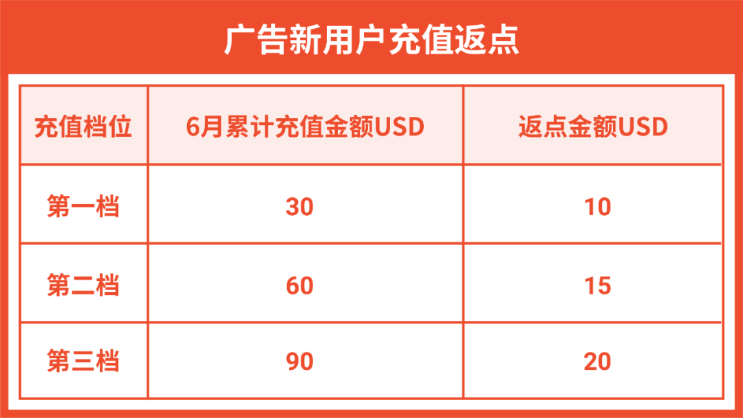 只要你是广告新用户,在2021年6月1日之前,从未进行广告充值的店铺,在活动期间 (2021.06.1 - 06.30)各个渠道进行广告充值,且当月充值累计达任意档位要求,则可获得对应档位奖励。