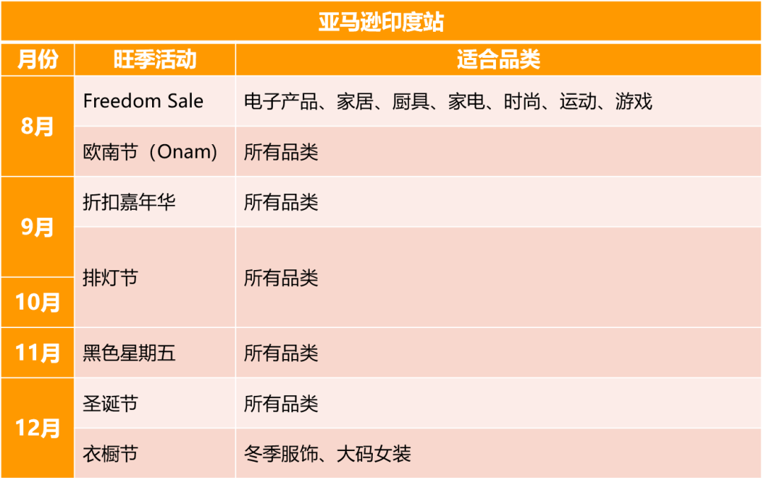 亚马逊印度站下半年的旺季中,除了黑五、圣诞等通用大型旺季节日,印度站还有一些特有的大型旺季,比如,印度全年最大的节日——排灯节,在为期近1个月的活动中,卖家销量增长在30%-3倍之间,亚马逊将在家用电器、电子产品、手机和配件、时尚、家居装饰等品类的优质产品上提供特别购买优惠和大量折扣,是销售这些品类的卖家赚取印度消费者钱包的好机会!