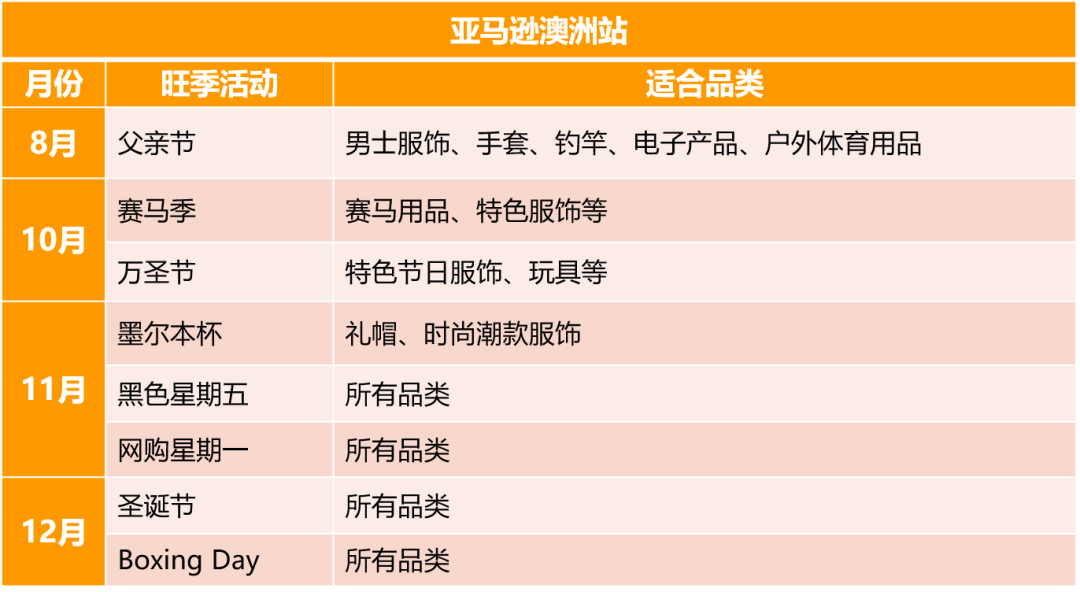 亚马逊澳洲站下半年的旺季主要集中在第四季度,除了黑五/网一、圣诞节、Boxing Day等亚马逊大型旺季活动外,澳洲站还有一项独特的重大活动——墨尔本杯,作为澳洲最著名的赛马比赛,澳洲人民在这一天会精心装扮出席赛马比赛,因此,与赛马相关用品、特色服饰等会十分受欢迎。
