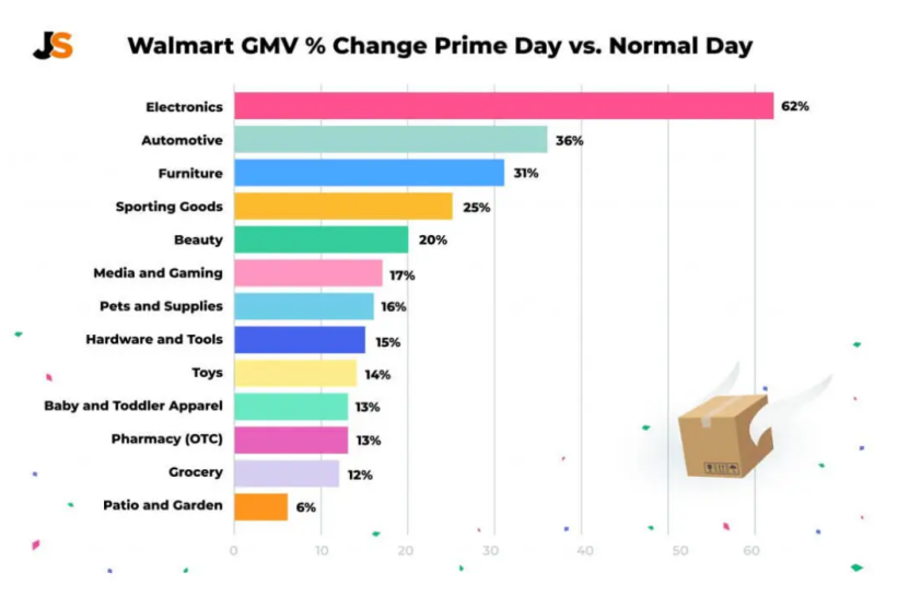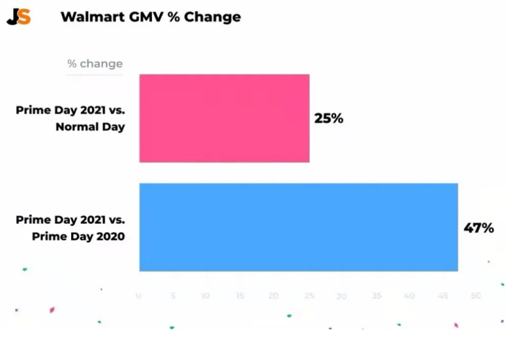 3.沃尔玛的增长速度非常快。据Jungle Scout调查数据,今年亚马逊Prime Day期间,沃尔玛的GMV比平常高出了25%,比去年Prime Day期间高出47%。