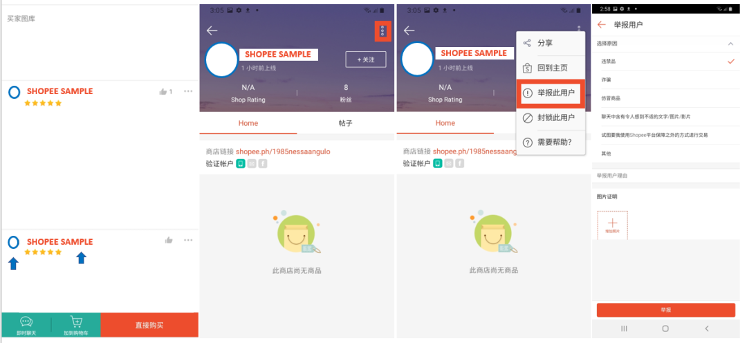找到该商店 → 点击右上角的「…」→ 点击「举报此用户(Report User)」→ 选择举报原因 → 点击「提交(Submit)」